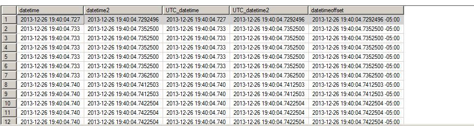 Unfortunately, only the latest version of SQL Server contains the DATETIMEOFFSETFROMPARTS. I say this is unfortunate because I am writing this from a SQL 2008 R2 machine, and the example that follows could be much more demonstrative the time zone sensitivity of the datetimeoffset data type if I hadn’t commented that code out. Nevertheless, let’s look at some comparison of datetime types.