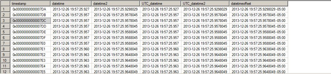 If we look closer at these values we’ll notice something. The right most digit in each and every value is limited to just a few numbers. In the case of the datetime values, I have come to understand that we can actually only capture 1/300th of a second as opposed to 1/1000th. As for the more precise data types it is unfortunate that in addition to leaving my SQL 2012 instance at work, I left my Cesium clock at the gym. That of course means, that I lack the tools to accurately determine how many nano-seconds precision we are realizing with our ability to store 100-nanoseconds.